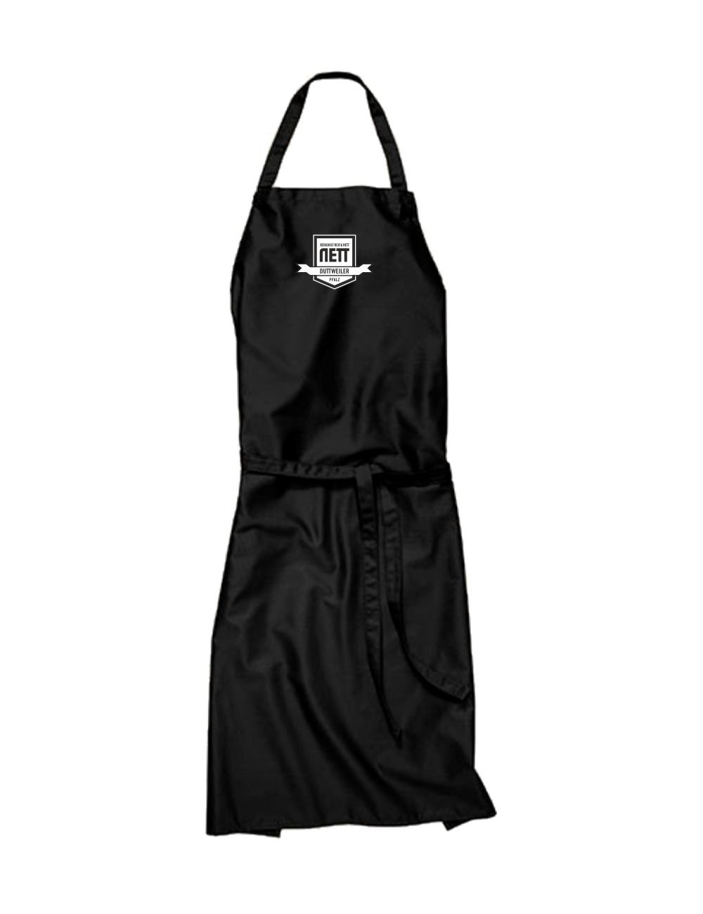 Textil: Lange Latzschürze mit Korderlverschluss in der Einheitsgröße 90×45 cm. 65% Baumwolle 35% Polyester (215g/m²) – Farbe: schwarz