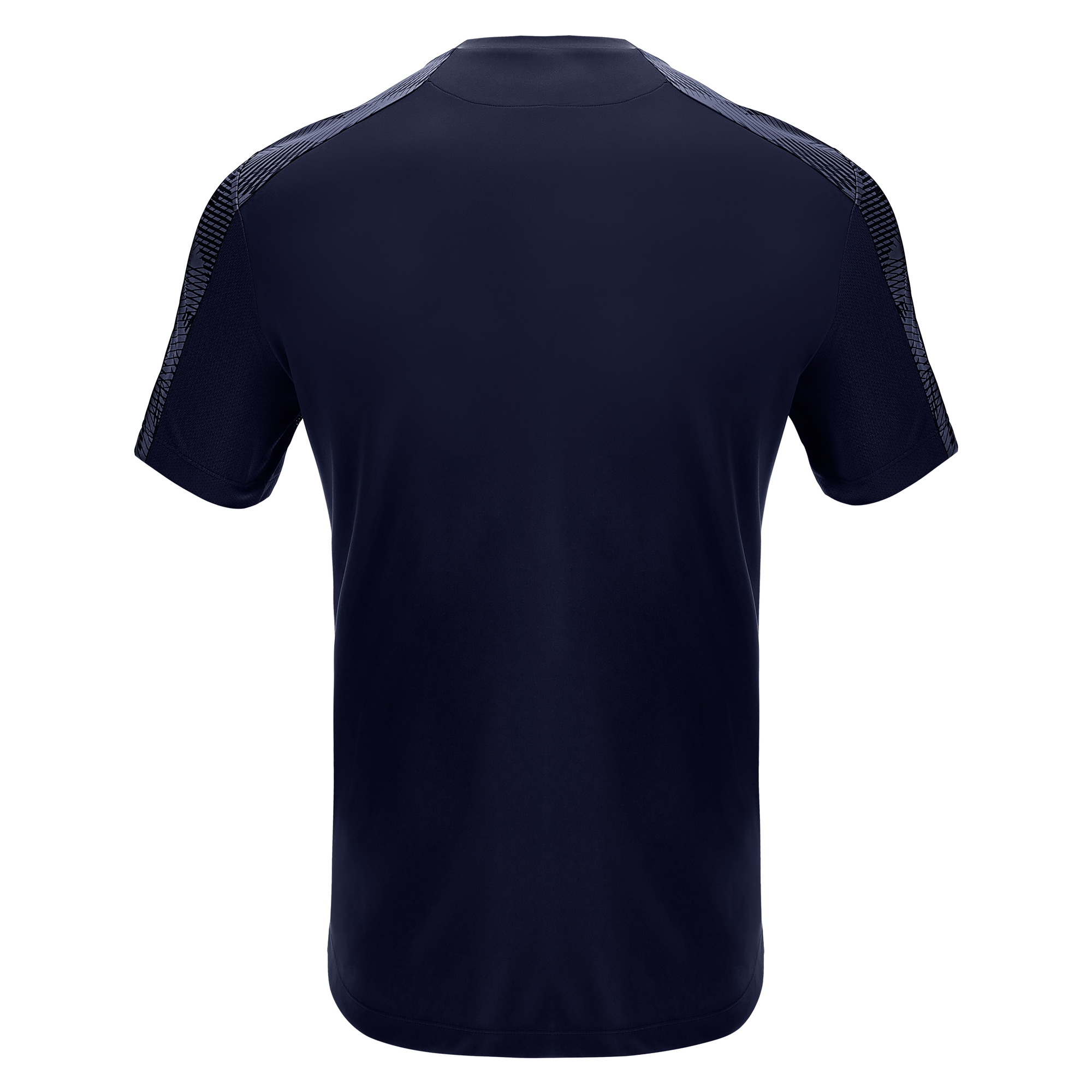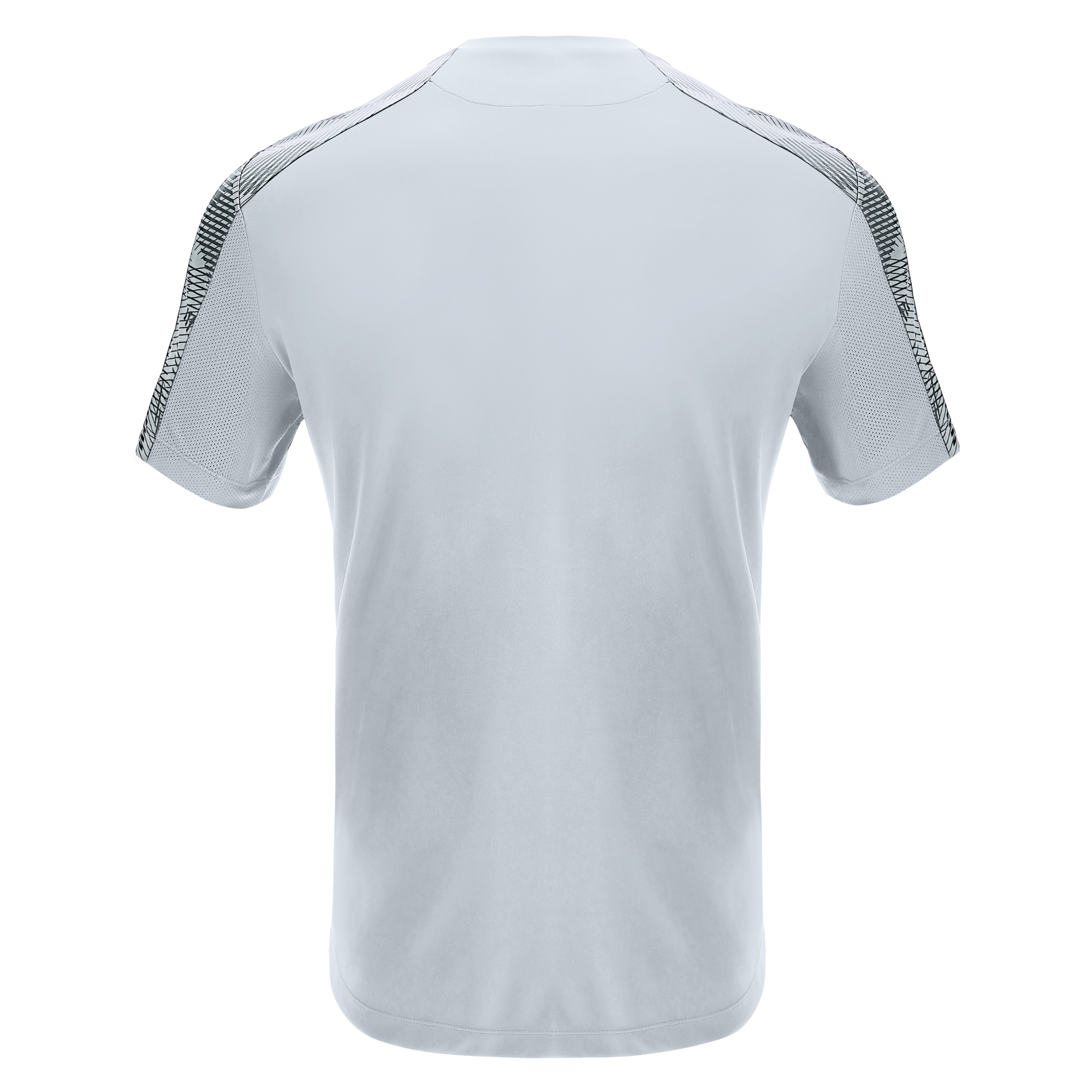 V-Ausschnitt aus Rippstrick und Kragenrückseite aus Hauptmaterial — Mesh-Einsätze im Achselbereich — Schulter- und Ärmeltextur aus optischem Sublimationsdruck