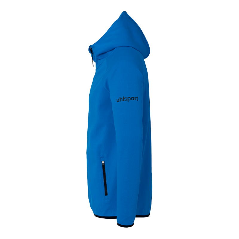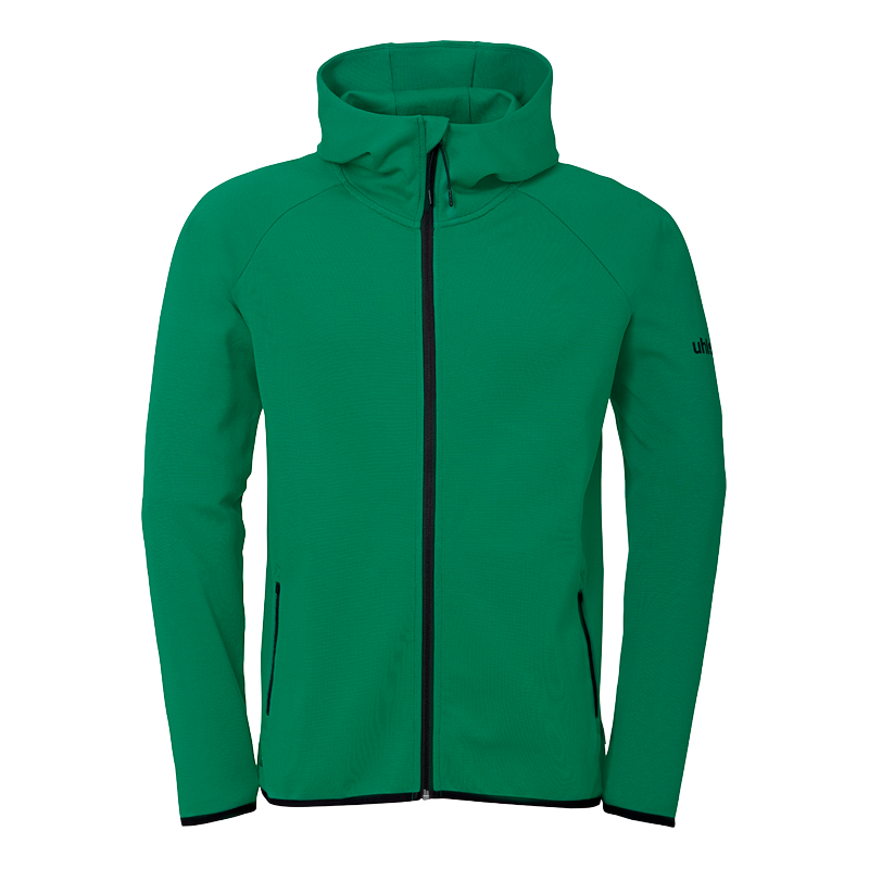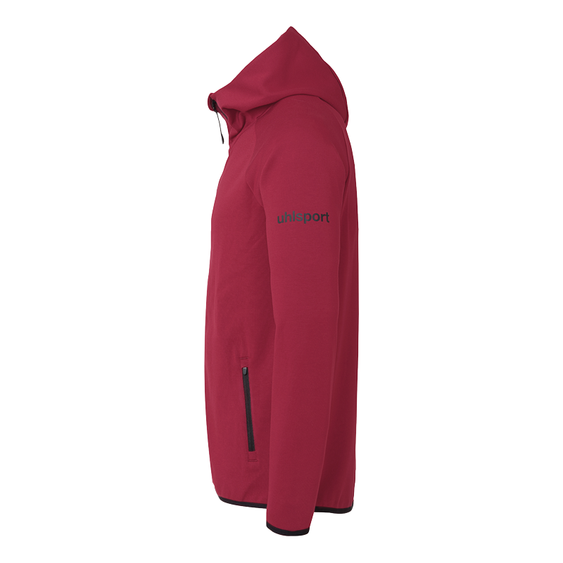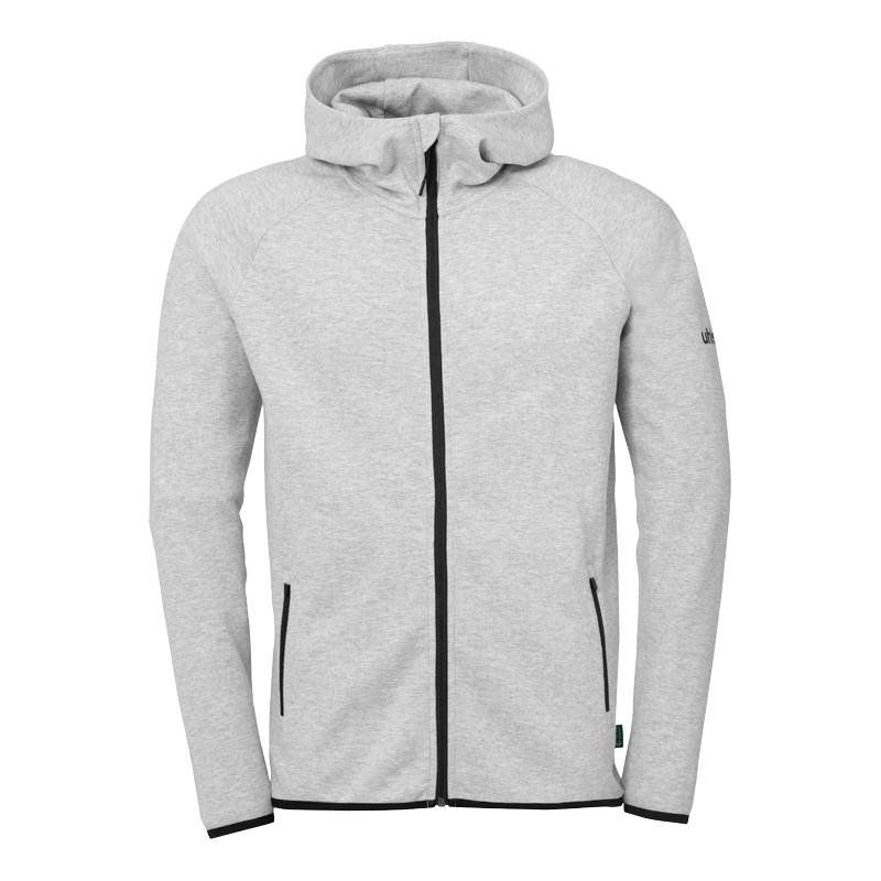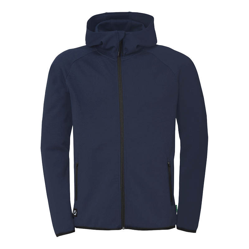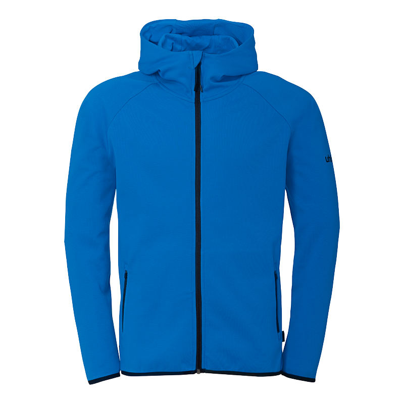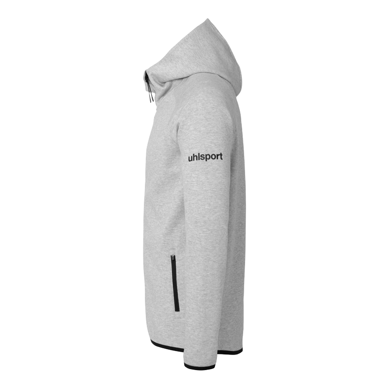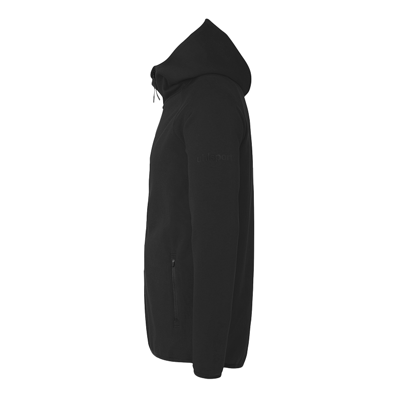 Kapuzenjacke mit hochabschließendem Kragen und Kapuze, welches ein gesäumtes Einfassband als Ärmelabschluss besitzt und darüber hinaus mit seitlichen Reißverschlusstaschen ausgestattet ist.