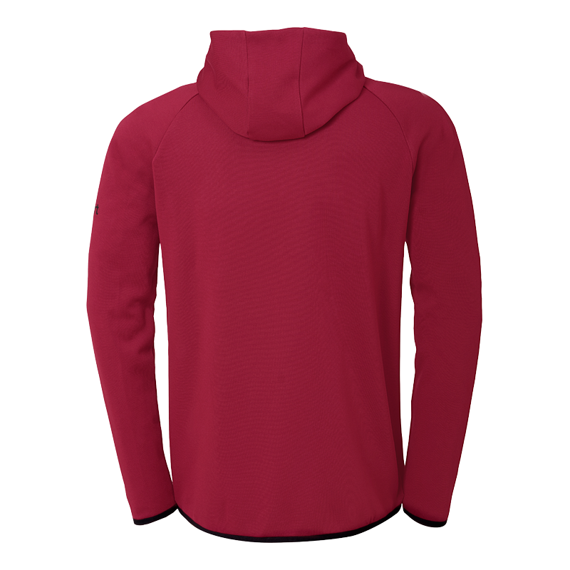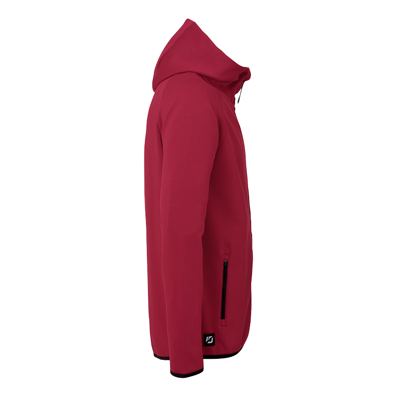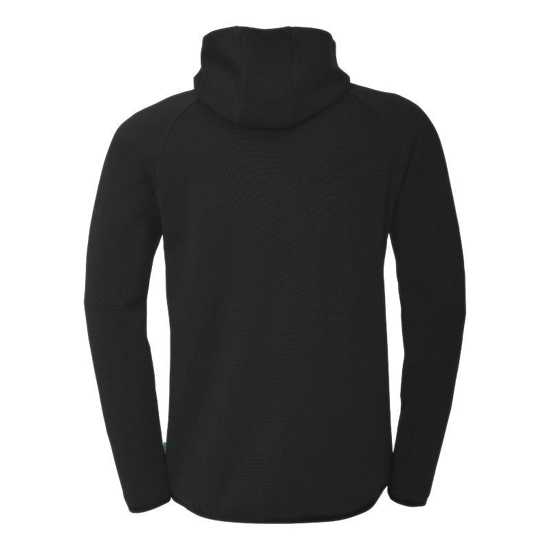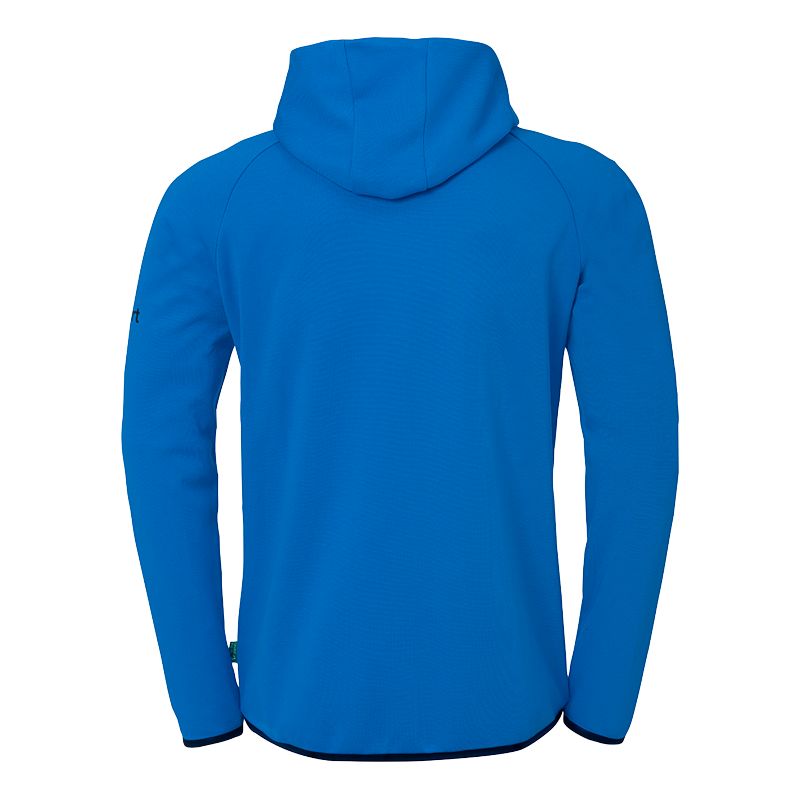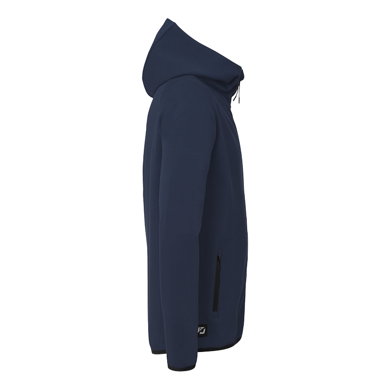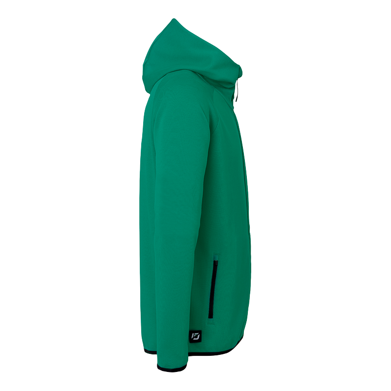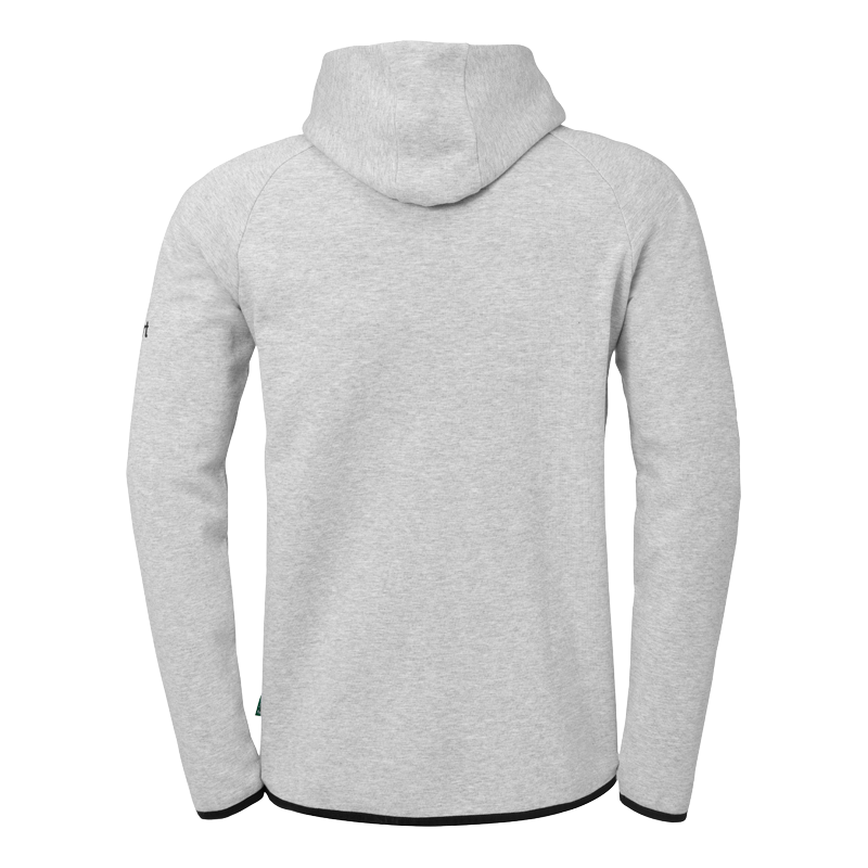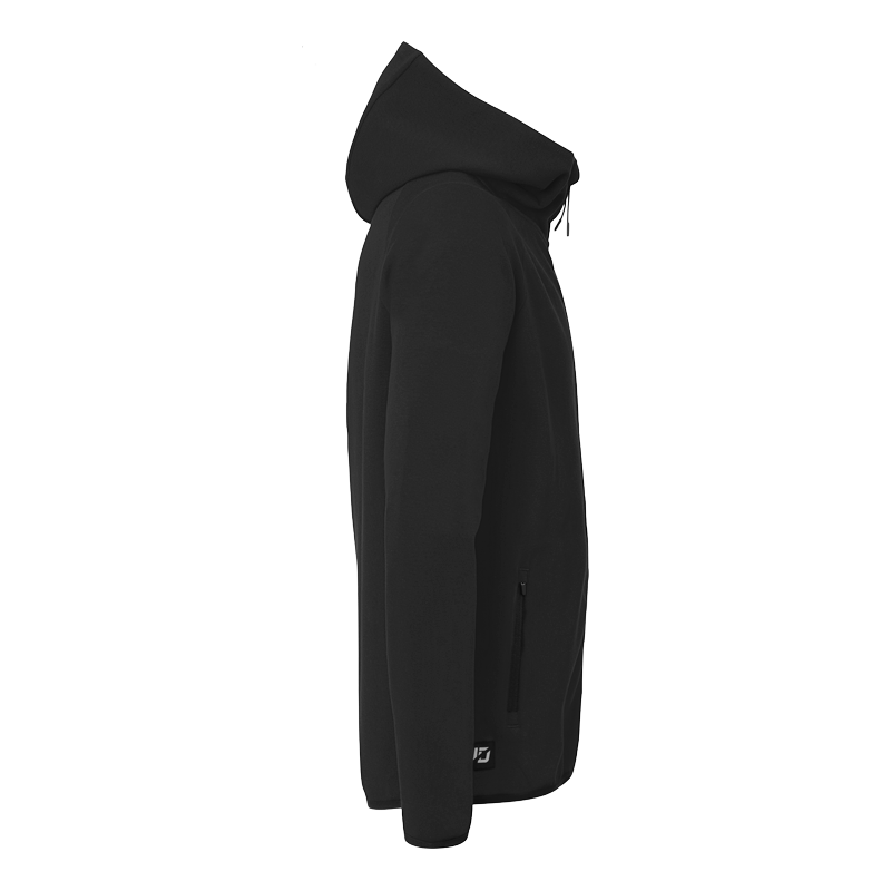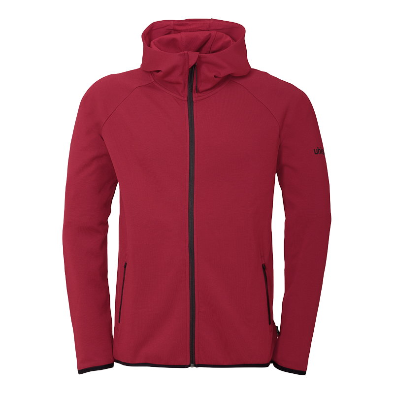 Kapuzenjacke mit hochabschließendem Kragen und Kapuze, welches ein gesäumtes Einfassband als Ärmelabschluss besitzt und darüber hinaus mit seitlichen Reißverschlusstaschen ausgestattet ist.