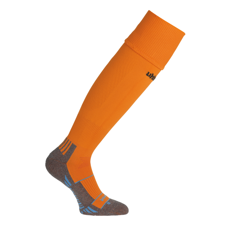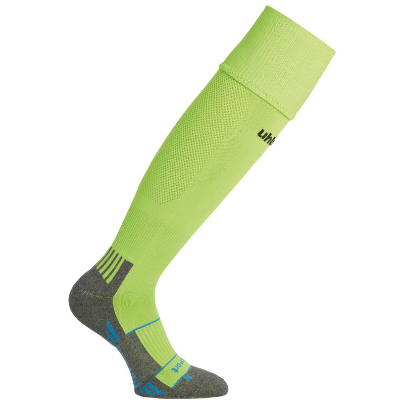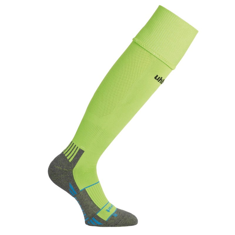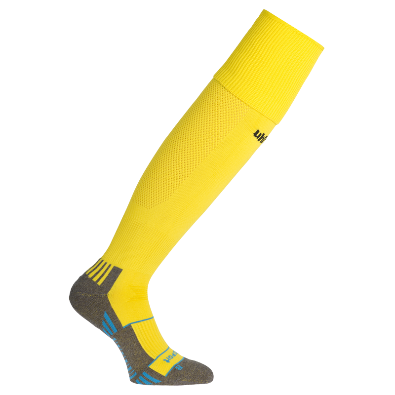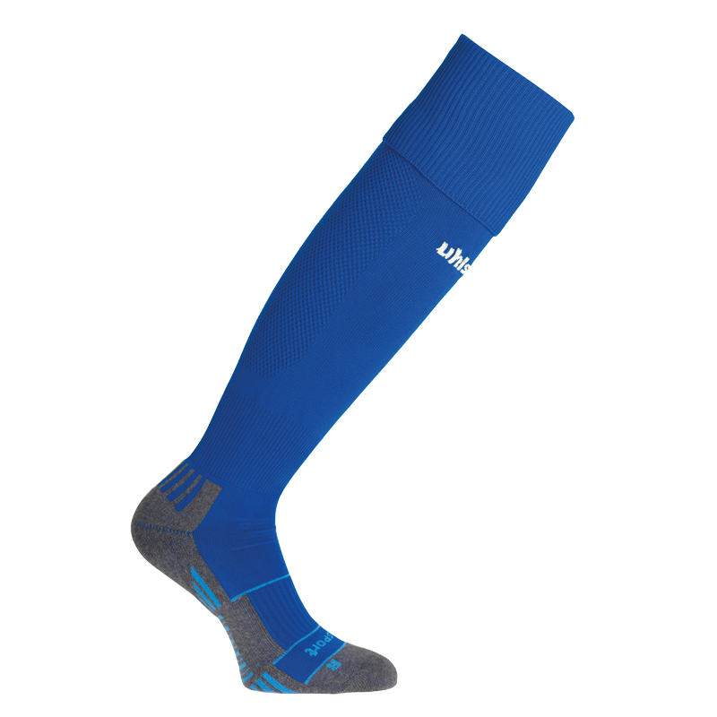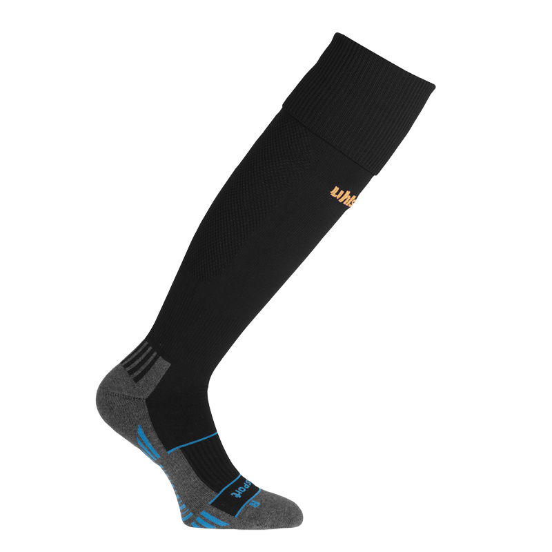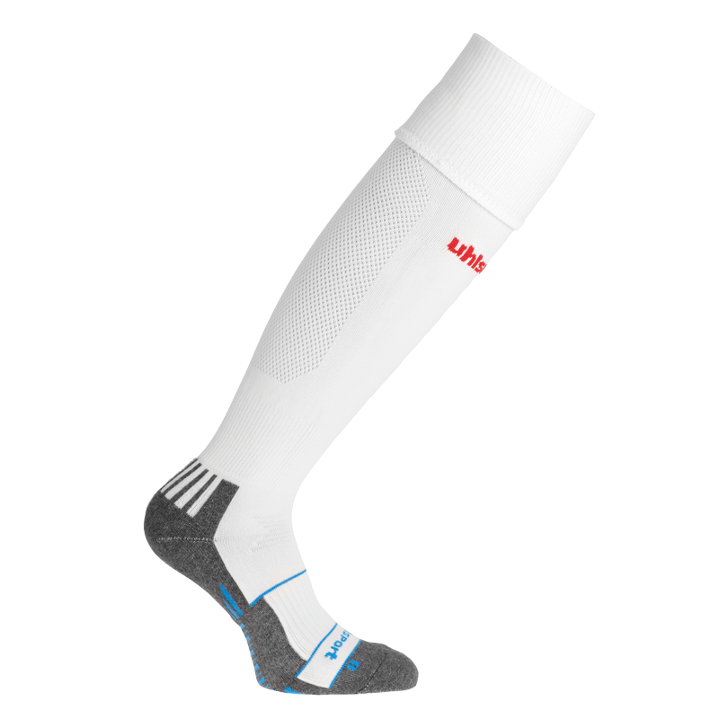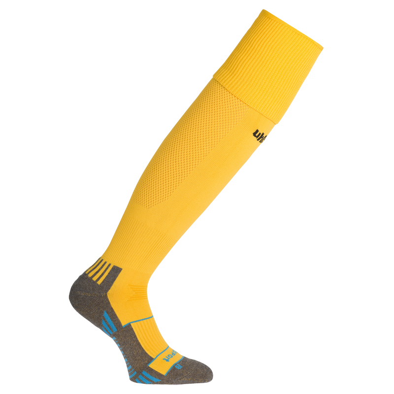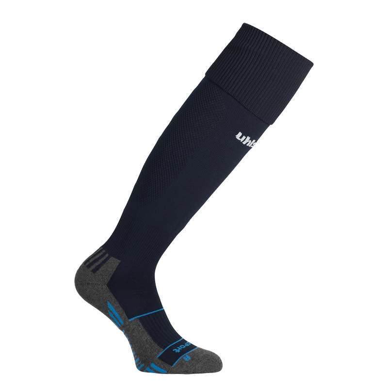 Textil: Stutzenstrumpf mit Baumwollfuß „Team Pro Player“ des Herstellers uhlsport (Hersteller-Artikelnummer 103691) – 73% Polyester 19% Bauwmolle 5% Polyamid 2% Polypropylen 1% Elasthan