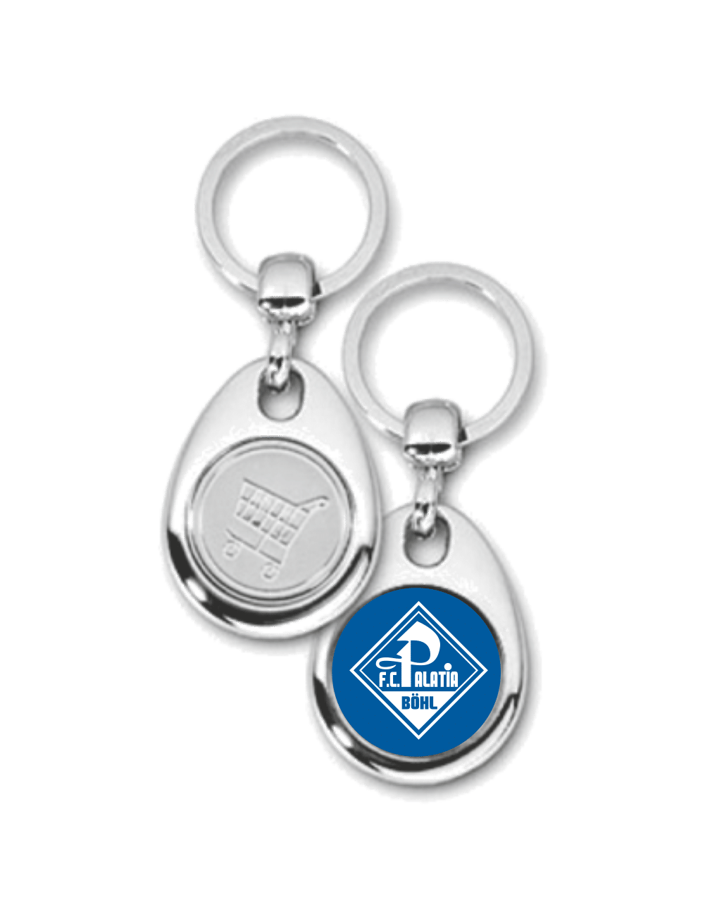 Schlüsselanhänger aus Metall mit Einkaufswagenchip und Ihrem Vereinslogo